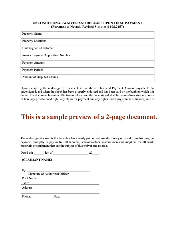 Nevada contractors, release your lien rights up to the date of a progress payment with this Unconditional Waiver and Release form.