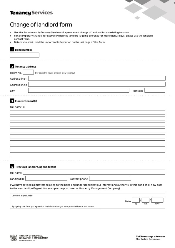 - This is a free PDF form supplied by the New Zealand Department of Building and Housing - Tenancy Services.