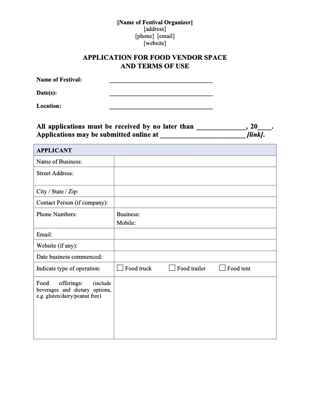 Sign up food truck vendors to operate at a weekly or monthly market with this combined Application Form and Contract template.