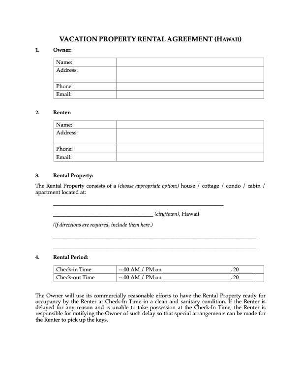 Hawaii Vacation Property Rental Application Form