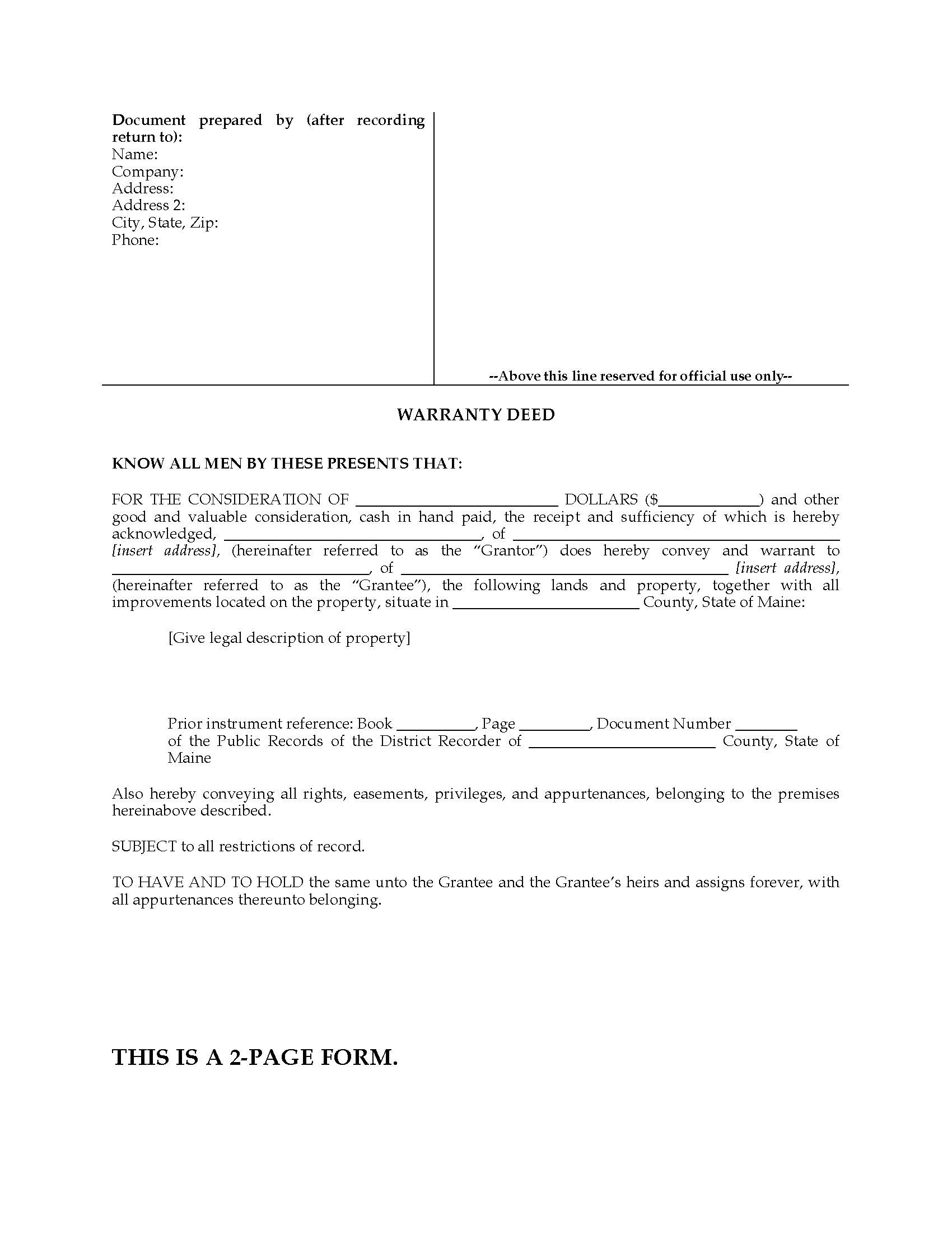 If you are selling a real estate property in Maine, you can assist the buyer by carrying part or all of the purchase price with this Contract for Deed (or land installment contract).