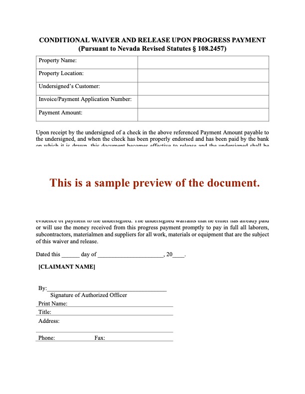 Nevada contractors, release your lien rights up to the date of a progress payment with this Conditional Waiver and Release of Lien form.