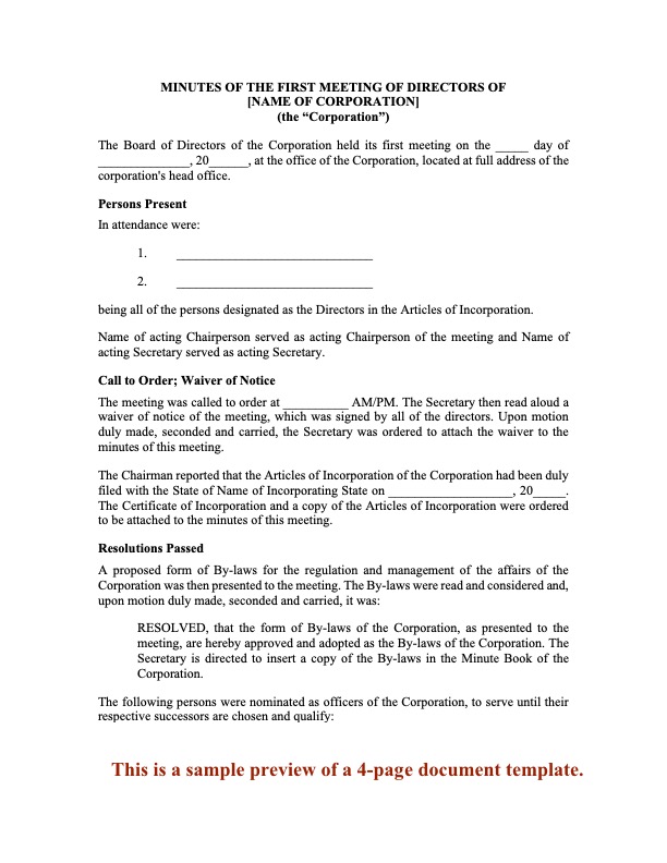 - Minutes of the first meeting of directors and shareholders following the incorporation.