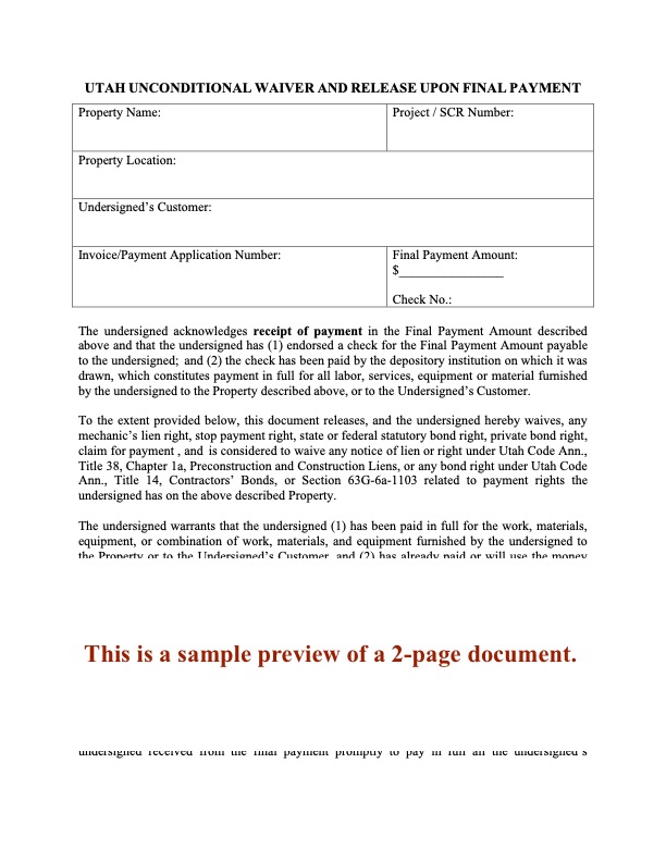 Utah Conditional Lien Waiver and Release on Final Payment